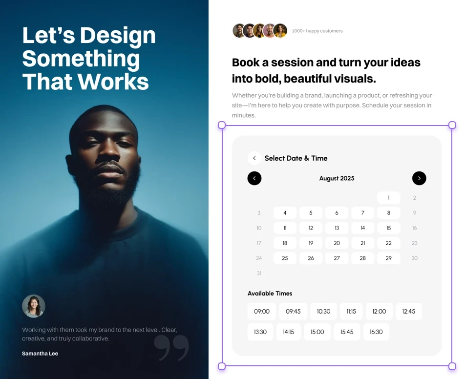Let visitors book calls, sessions, or services — with full calendar logic and instant admin sync.