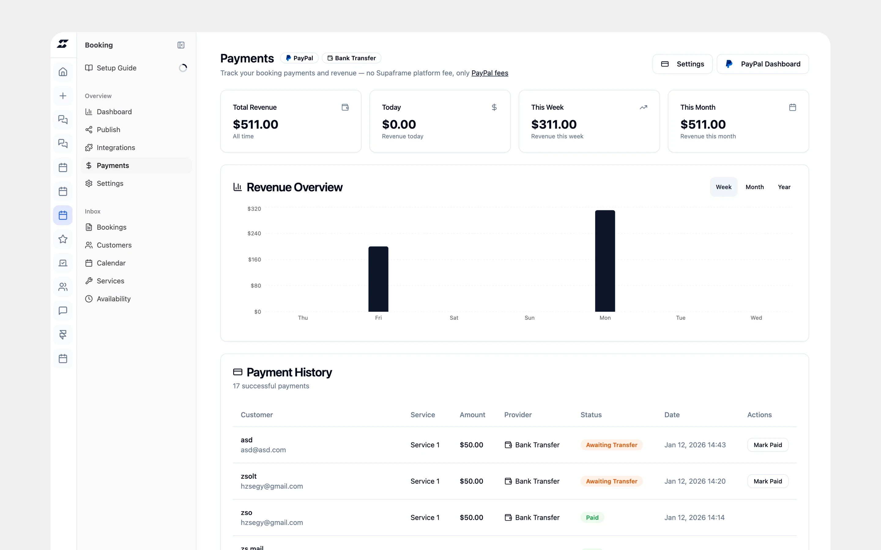 All payment tracking happens in the same dashboard as bookings.