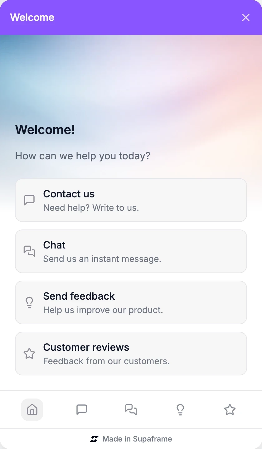 All your website interactions live in one Supaframe dashboard. Use the Supaframe Hub to combine multiple widgets into a single floating button, giving visitors easy access to chat, booking, forms, and more — all managed from one place.