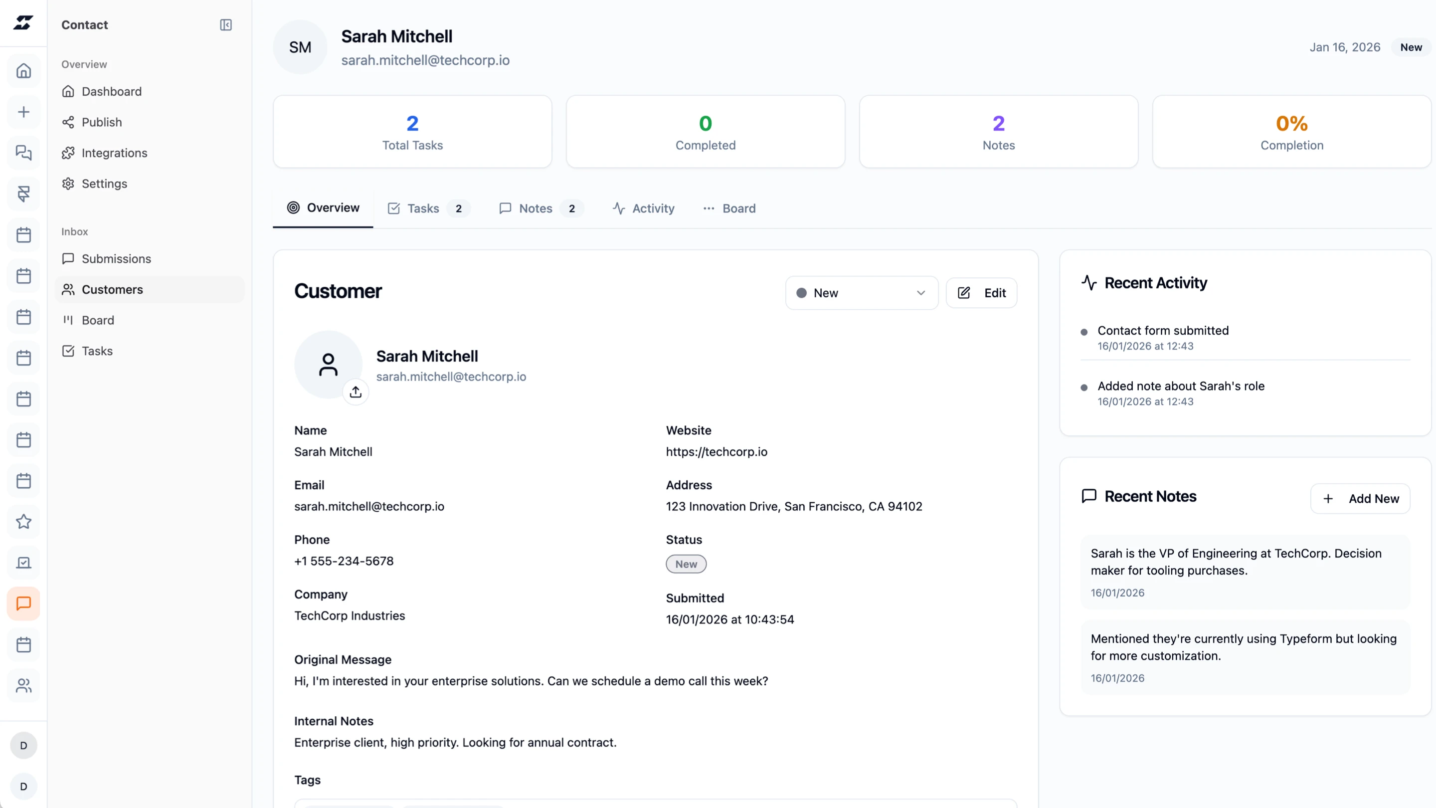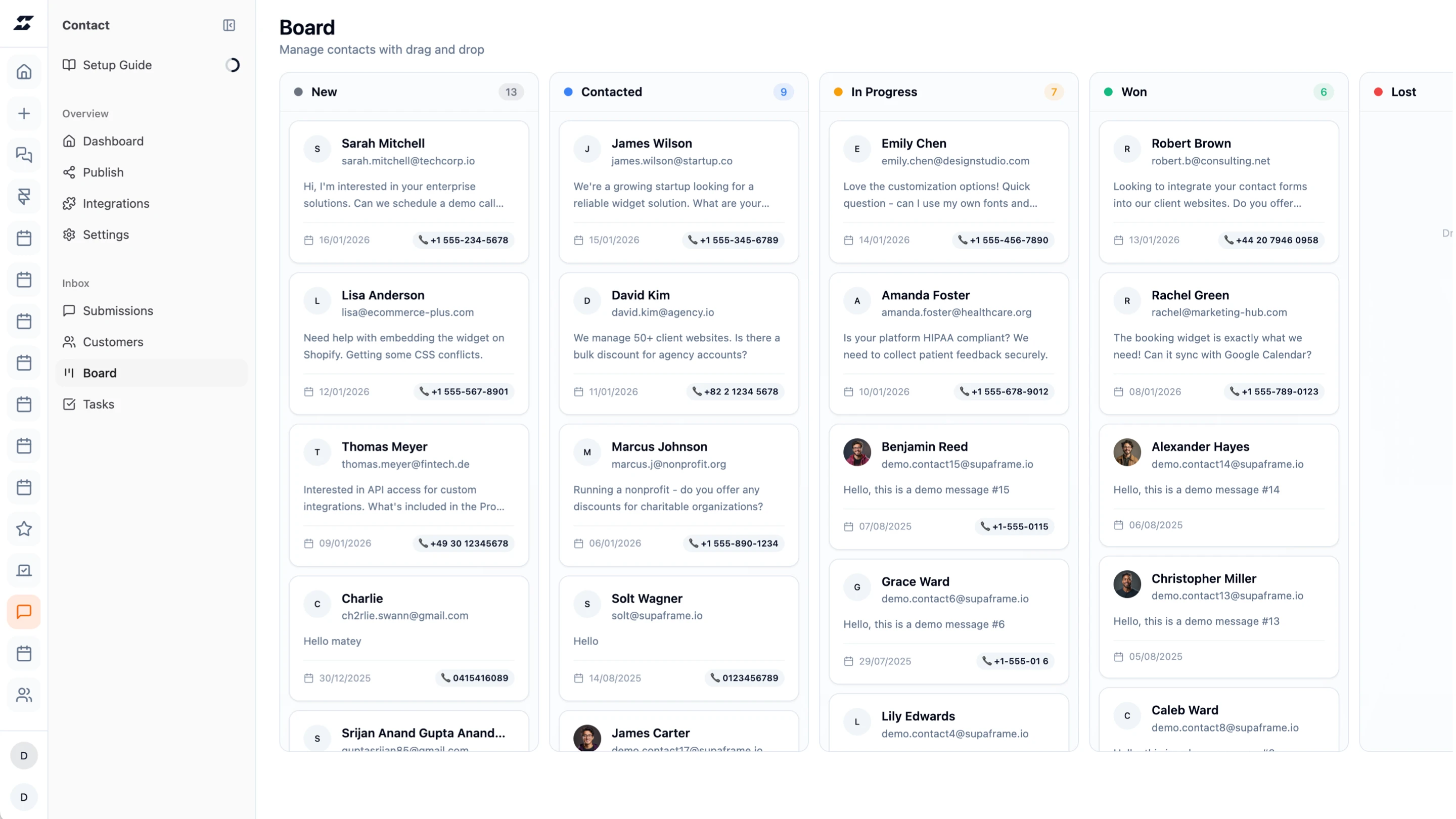 Add a contact form to any website — with a native Framer component included — and turn submissions into structured leads automatically. Every inquiry goes straight into your Supaframe CRM dashboard, where you can track progress, add context, and follow up without losing anything in your inbox. No plugins. No backend. Just a simple CRM that works behind your website.