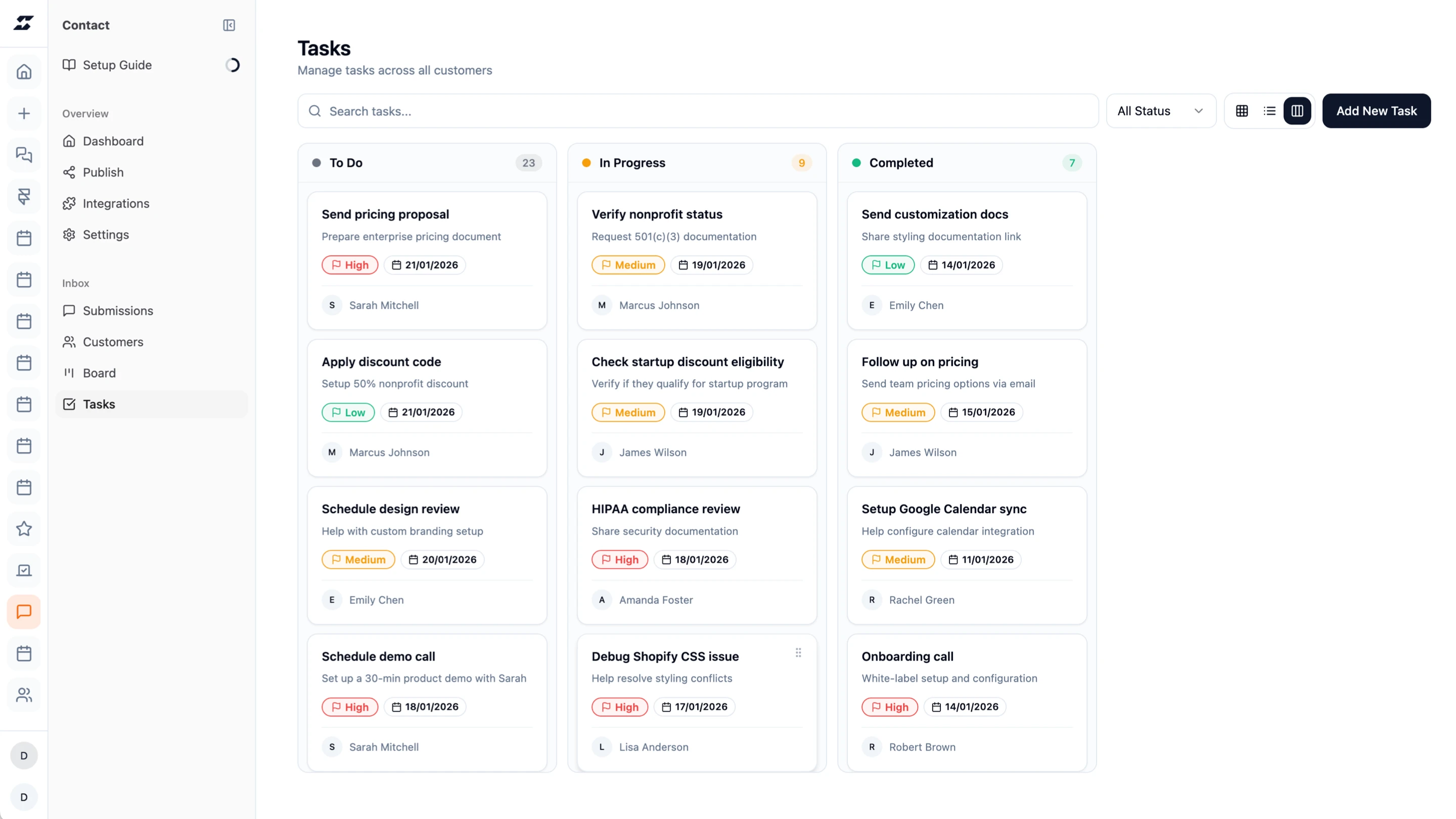 All your data, one place. View submissions, manage customers, track tasks, and monitor activity across all components in a clean, unified interface.