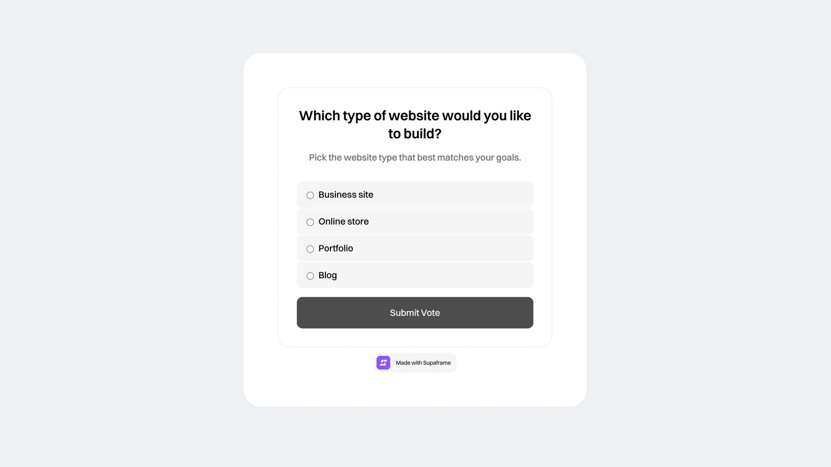 Add a poll to any website — with a native Framer component included — and collect quick feedback from your visitors. Use polls to validate ideas, gather opinions, or make decisions based on real input, not guesses. Manage everything from your Supaframe dashboard and keep full control over how results are shown