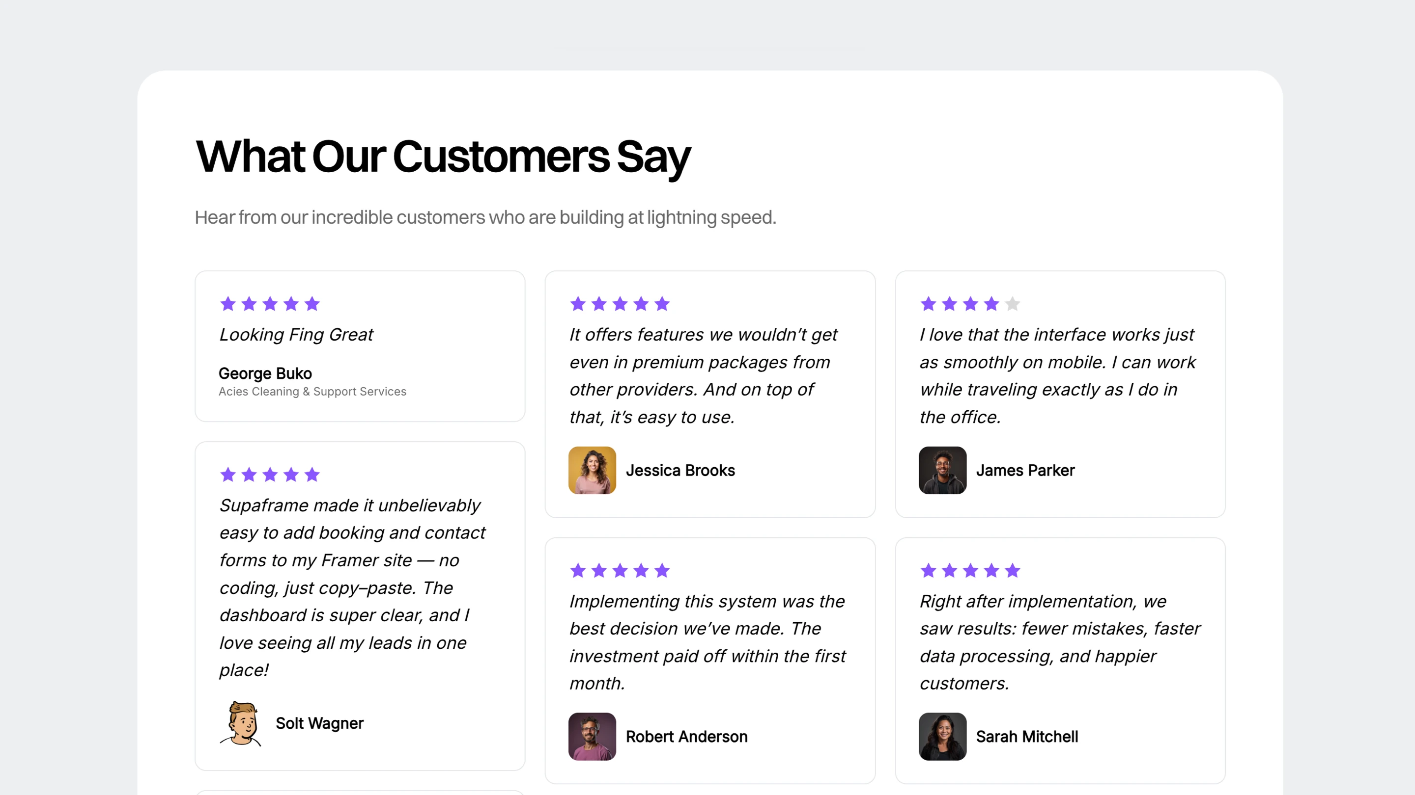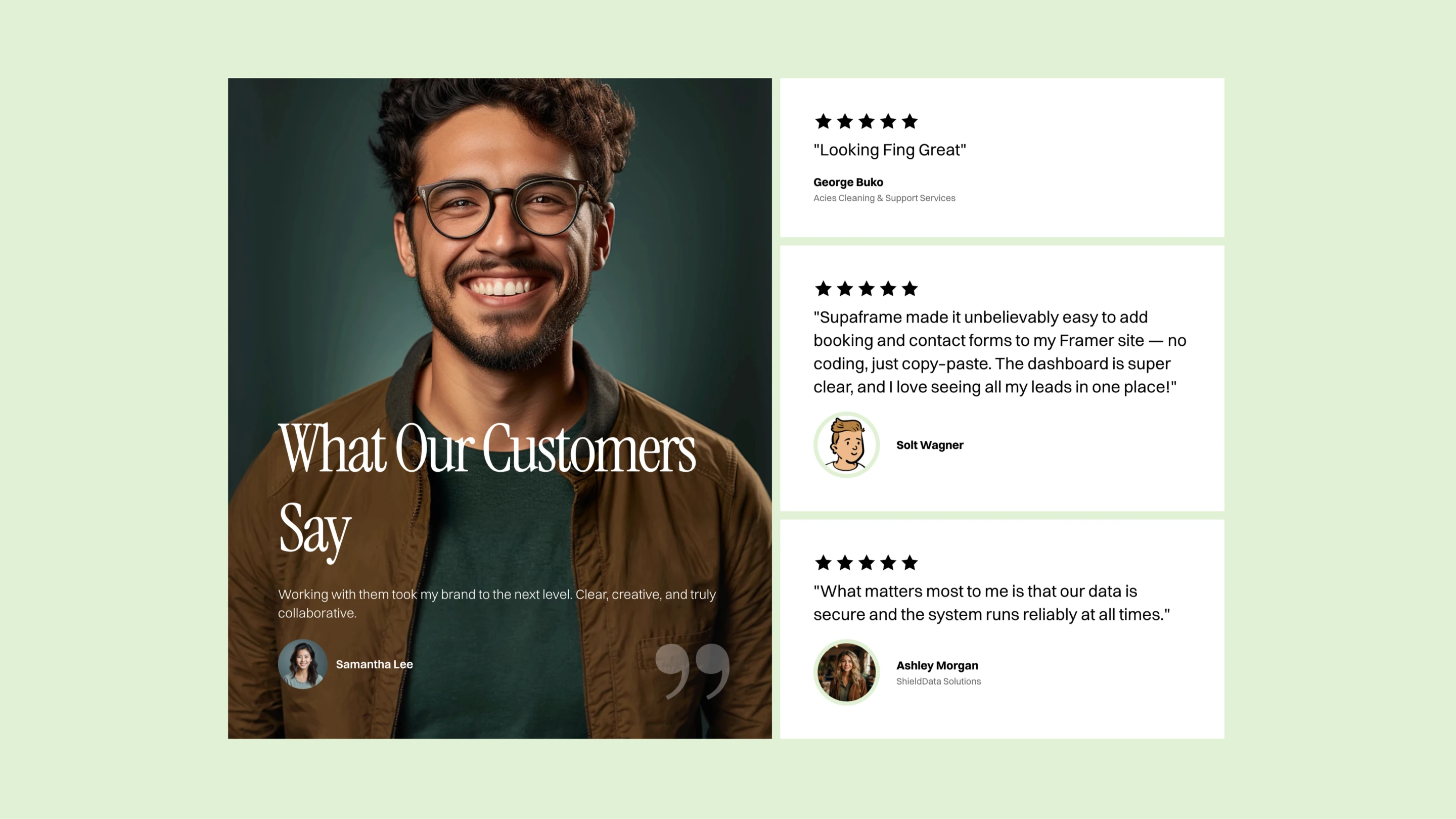 Collect testimonials through a simple form on any website — with a native Framer component included — then review, approve, and manage everything from your Supaframe dashboard. Show only the testimonials you trust, and turn real customer feedback into credibility that converts.